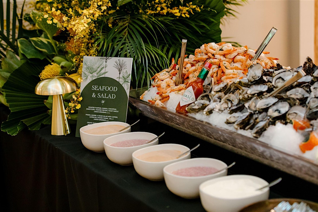 • Accompaniments: mignonette, nam jim, Marie Rose sauce, Tabasco, lemon & lime wedges